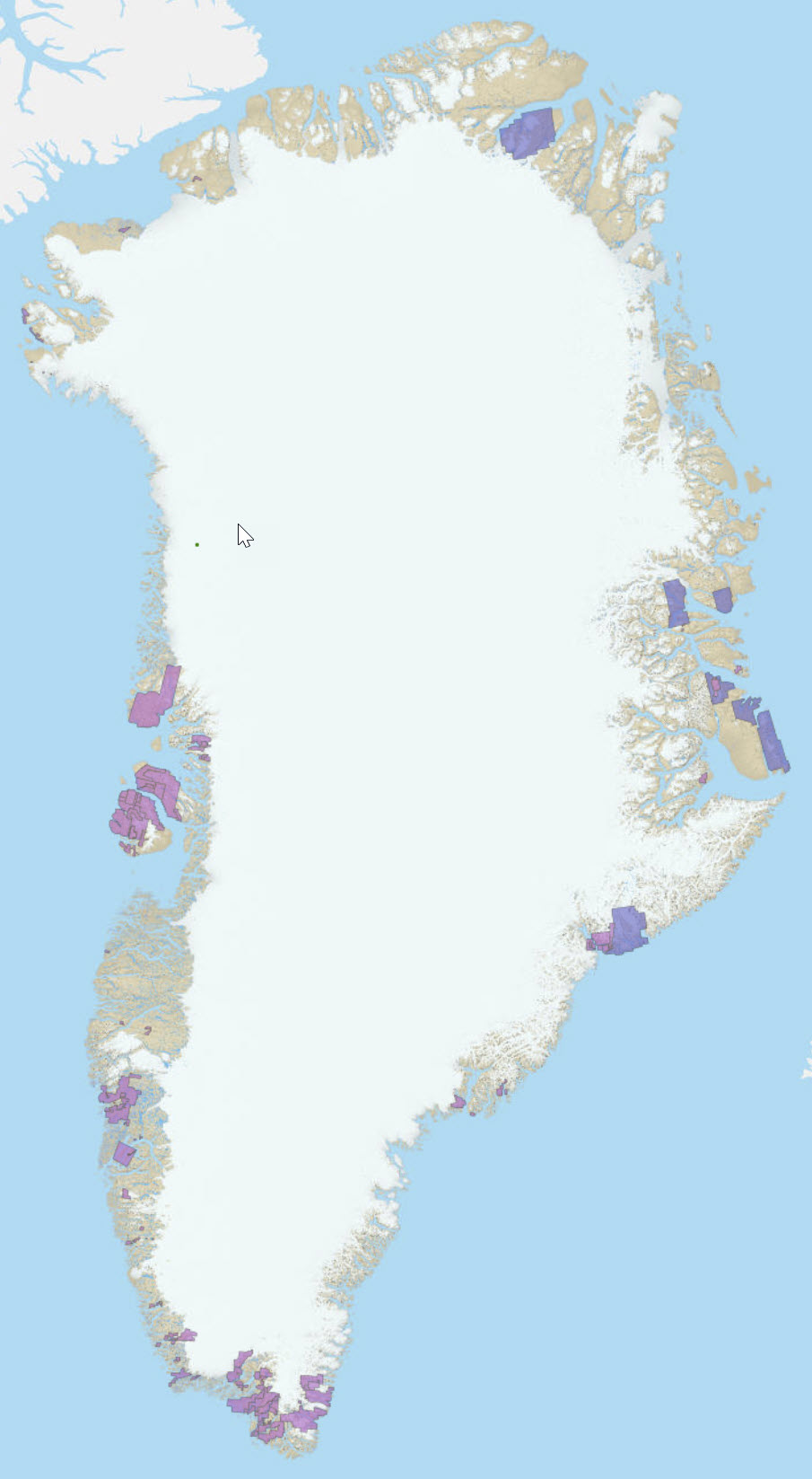 All active exploration licences. The data are converted from the WFS that th ministery of mineral resources (MMR) in Greenland provides. Links are provided in the online resources